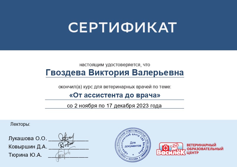 2023 г. – Курс для ветеринарных врачей «От ассистента до врача», Ветеринарный образовательный центр Василёк