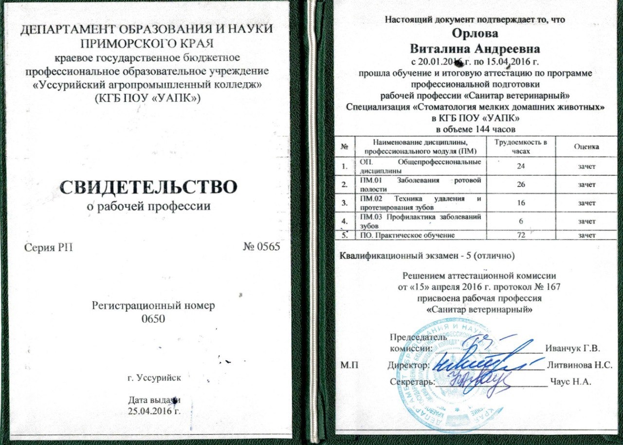 2016 – КГБ ПОУ "Уссурийский агропромышленный колледж" «Стоматология мелких домашних животных»